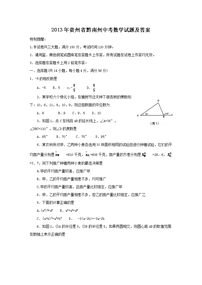 【文档名称】 2013年贵州省黔南州中考数学试题及答案(Word版).doc