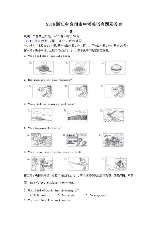【文档预览】 无忧考网整理发布2016浙江省台州市中考英语真题及答案(Word版),前五页预览如下: