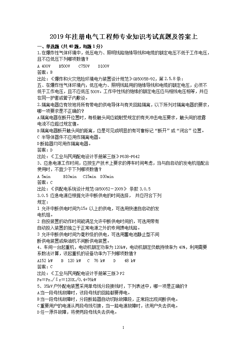 【文档预览】 无忧考网整理发布2019年注册电气工程师专业知识考试真题及答案上(Word版),前五页预览如下: