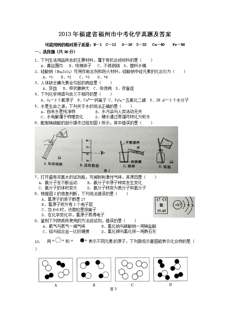 【文档名称】 2013年福建省福州市中考化学真题及答案(Word版).doc