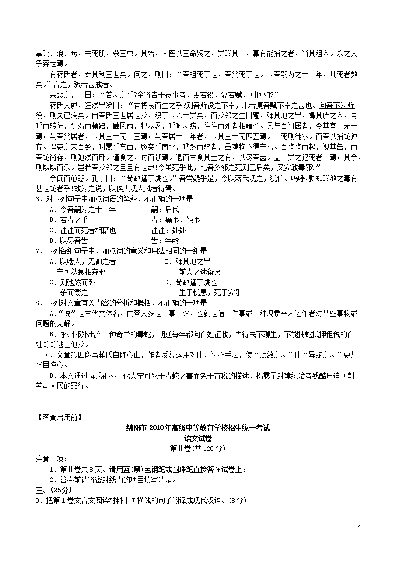 【文档名称】 2010年四川省绵阳市中考语文真题及答案(Word版).doc
