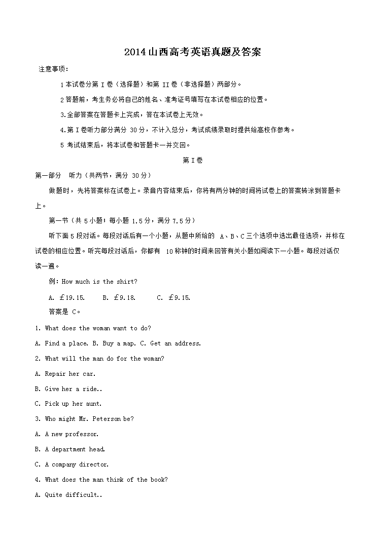 【文档预览】 无忧考网整理发布2014山西高考英语真题及答案(Word版),前五页预览如下: