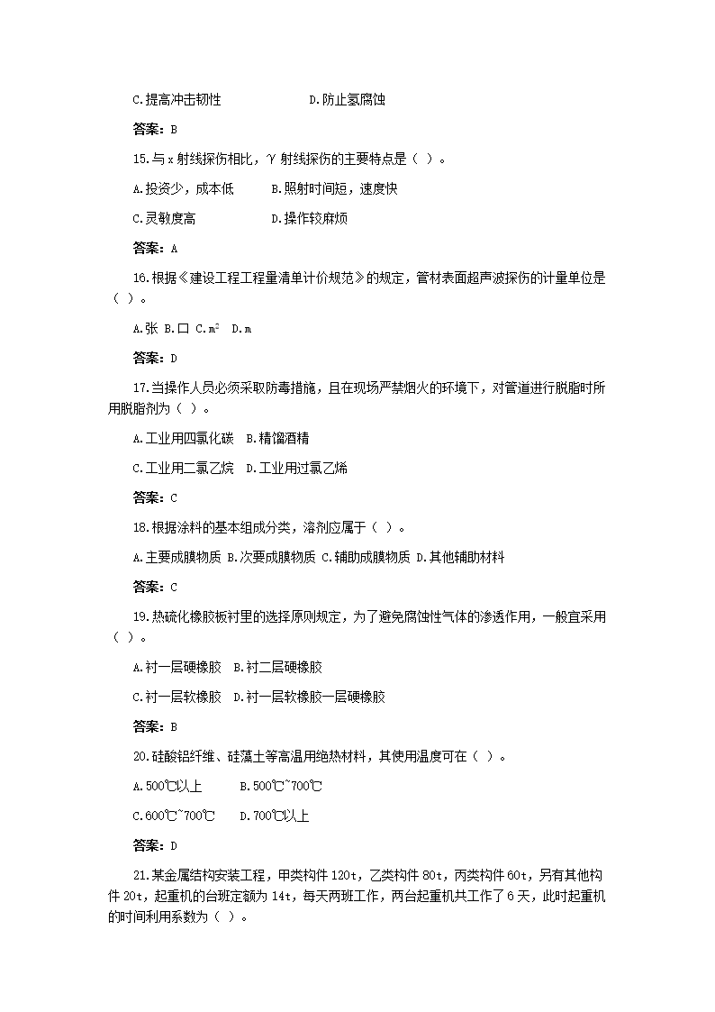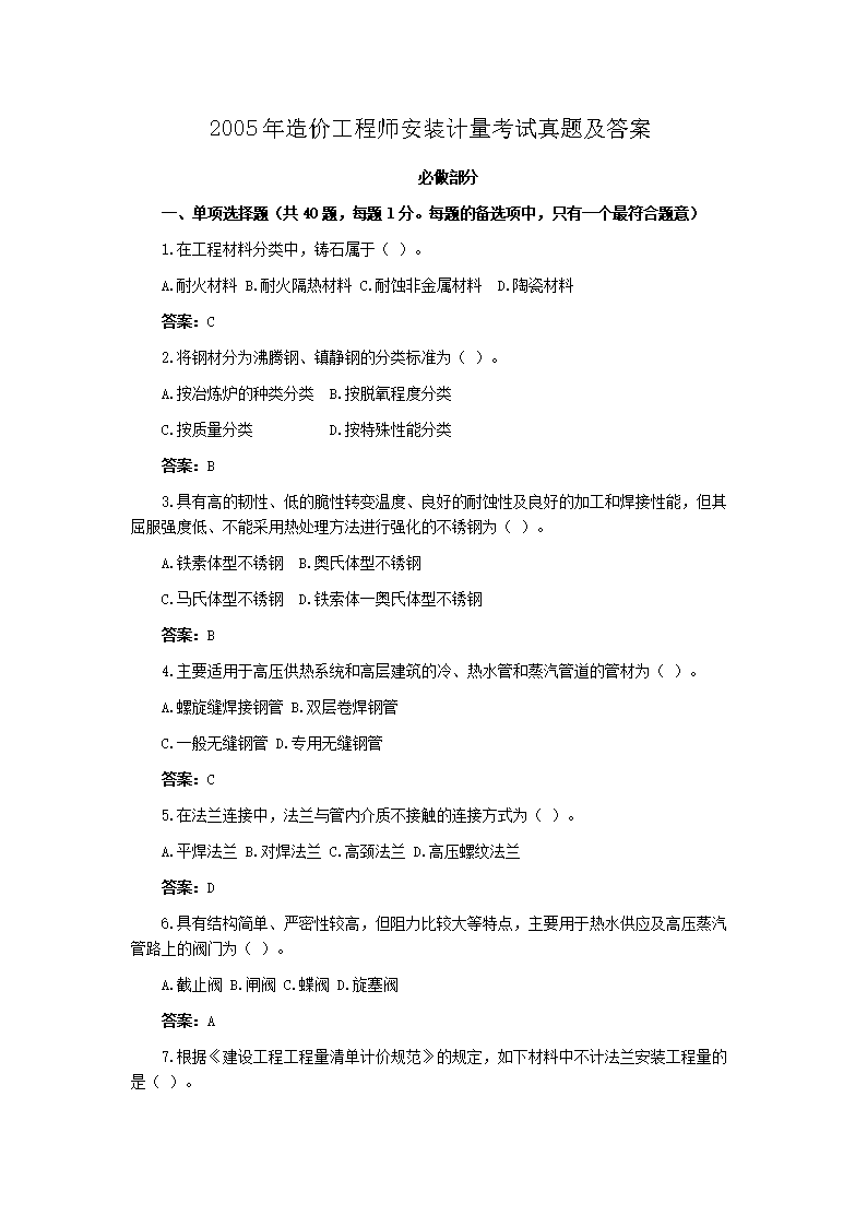 【文档名称】 2005年造价工程师安装计量考试真题及答案(Word版).doc
