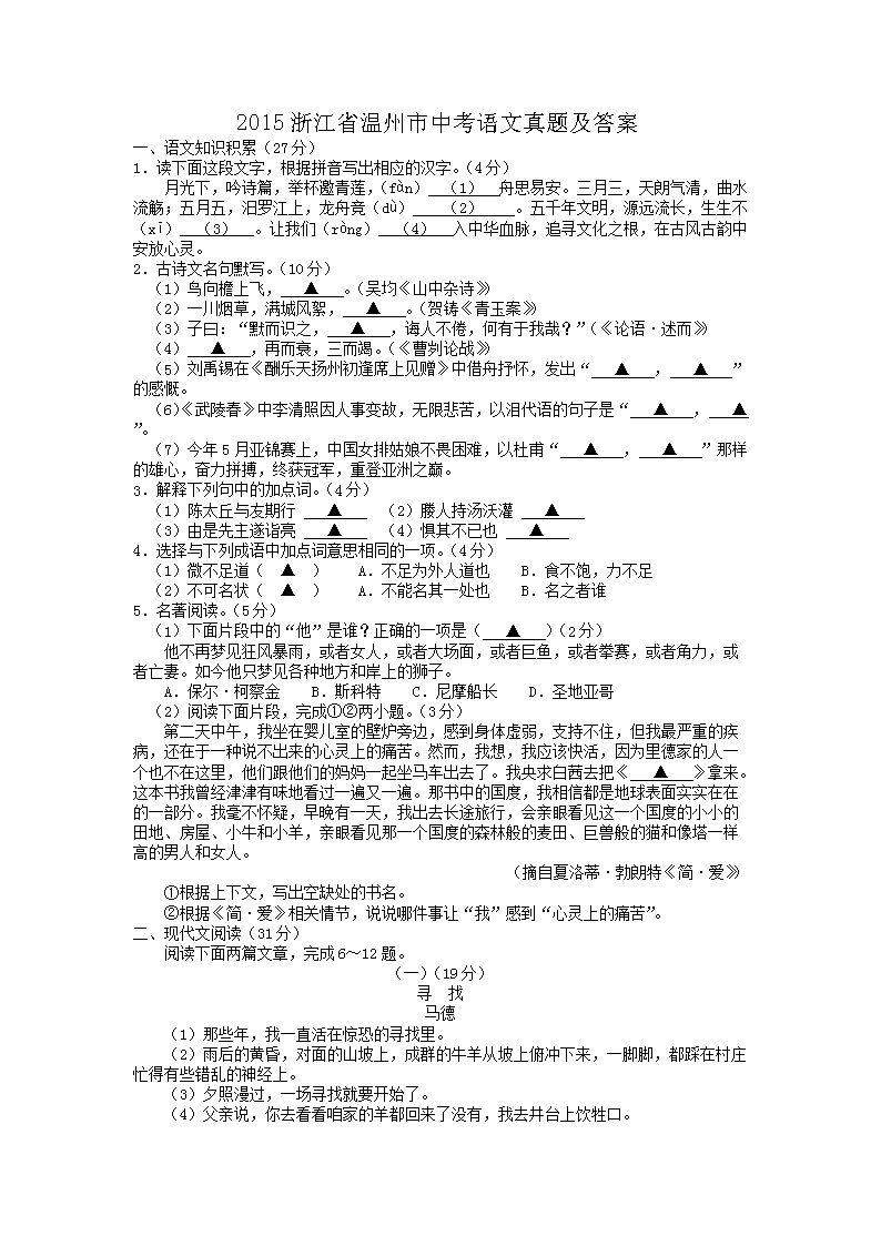 【文档名称】 2015浙江省温州市中考语文真题及答案(Word版).doc