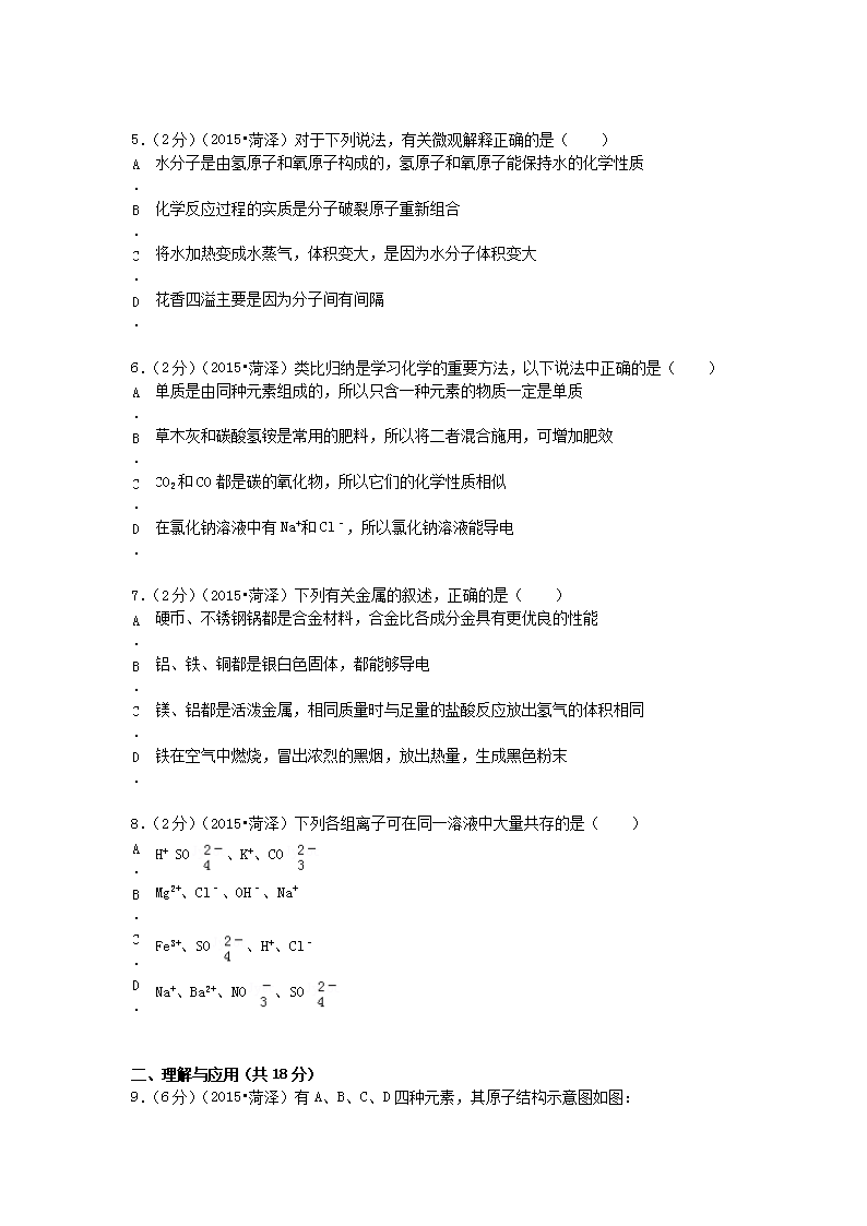 【文档预览】 无忧考网整理发布2015山东省菏泽市中考化学真题及答案(Word版),前五页预览如下: