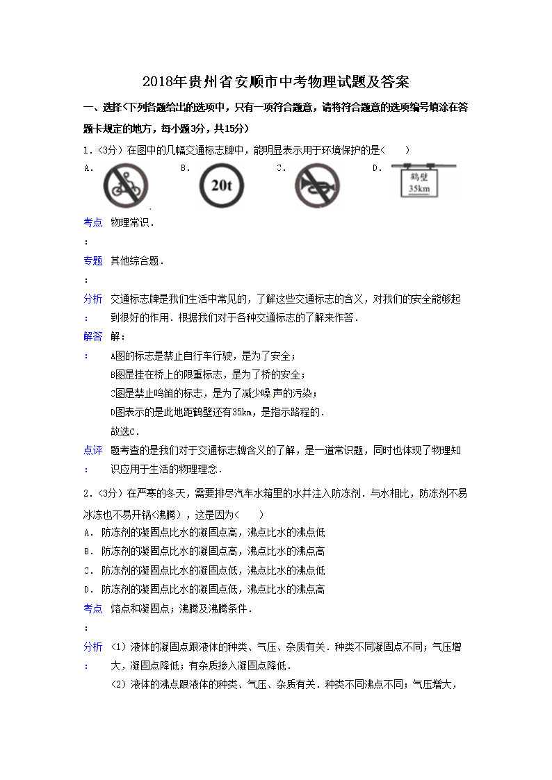 【文档预览】 无忧考网整理发布2018年贵州省安顺市中考物理试题及答案(Word版),前五页预览如下: