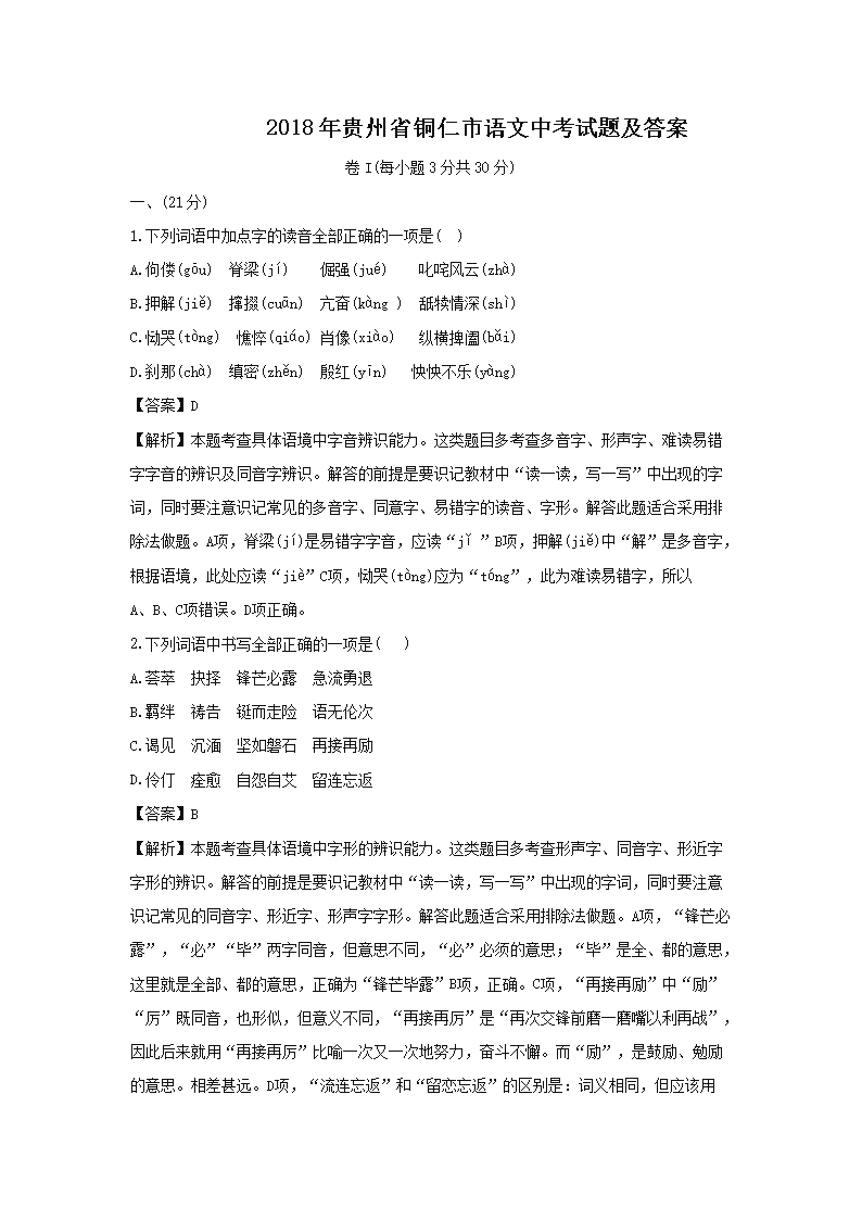 【文档名称】 2018年贵州省铜仁市语文中考试题及答案(Word版).doc