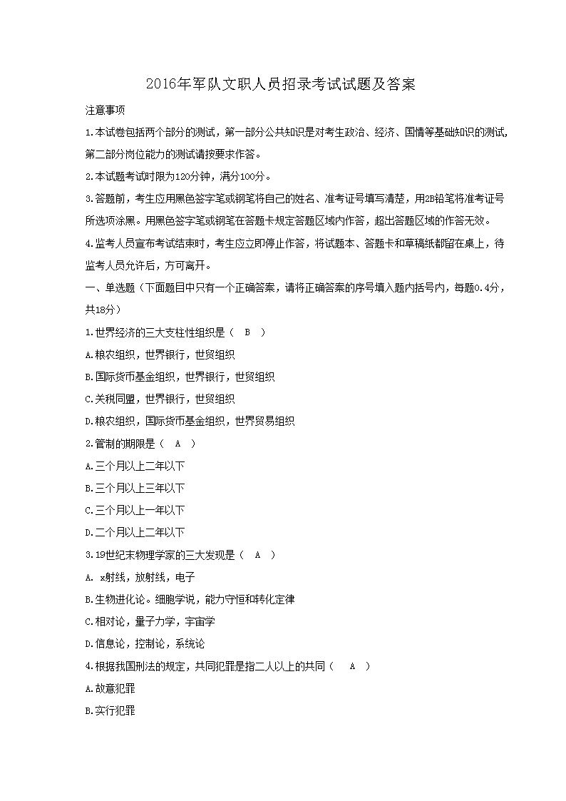 【文档名称】 2016年军队文职人员招录考试试题及答案(Word版).doc