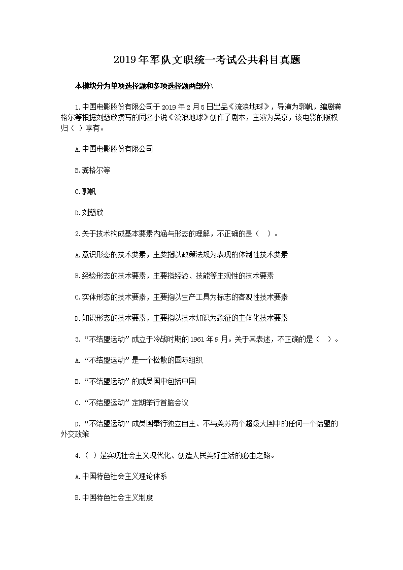 【文档名称】 2019年军队文职统一考试公共科目真题(Word版).doc