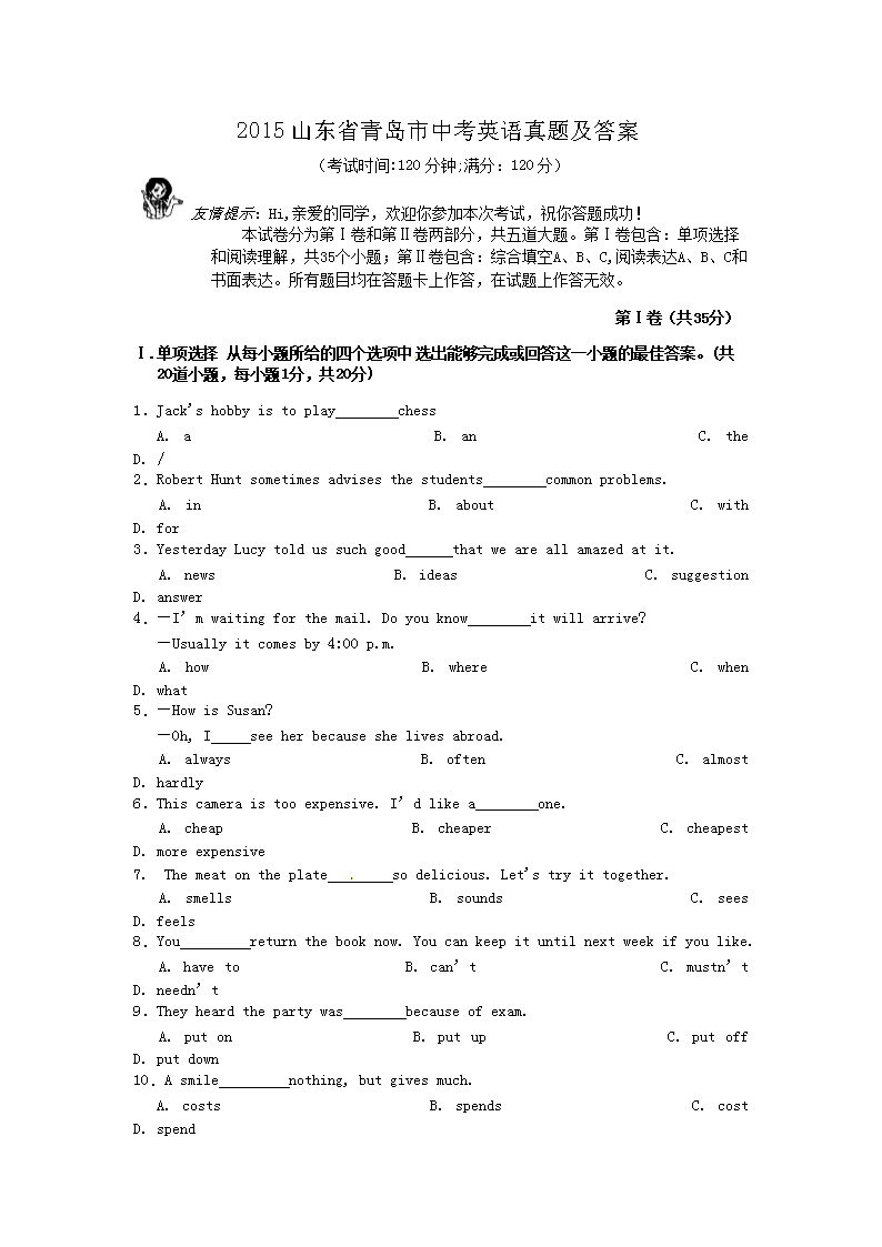 【文档预览】 无忧考网整理发布2015山东省青岛市中考英语真题及答案(Word版),前五页预览如下: