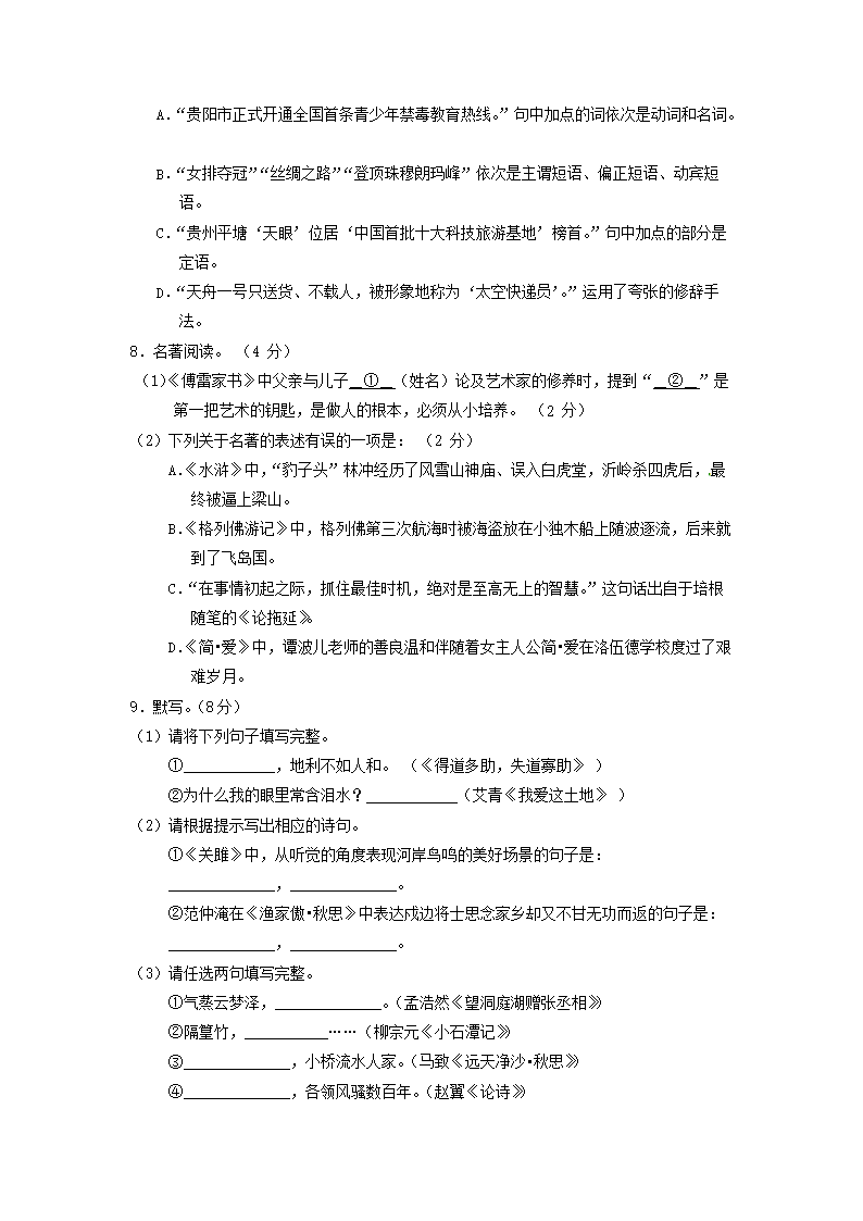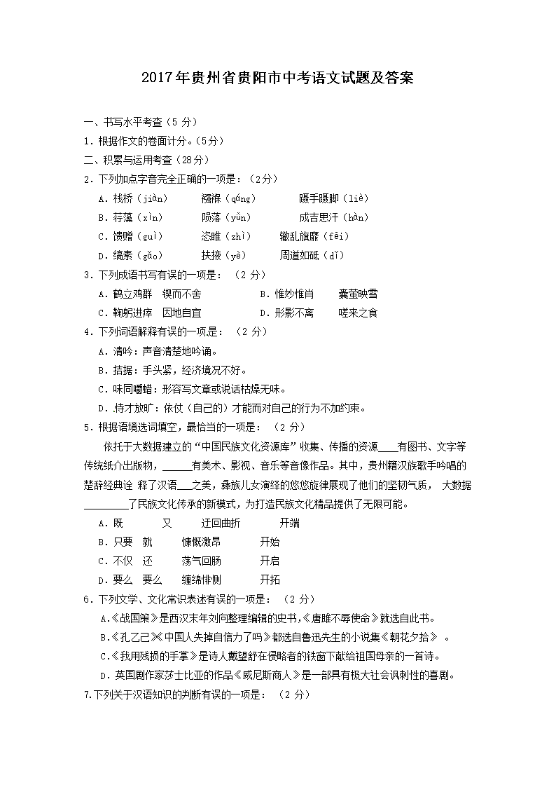 【文档名称】 2017年贵州省贵阳市中考语文试题及答案(Word版).doc