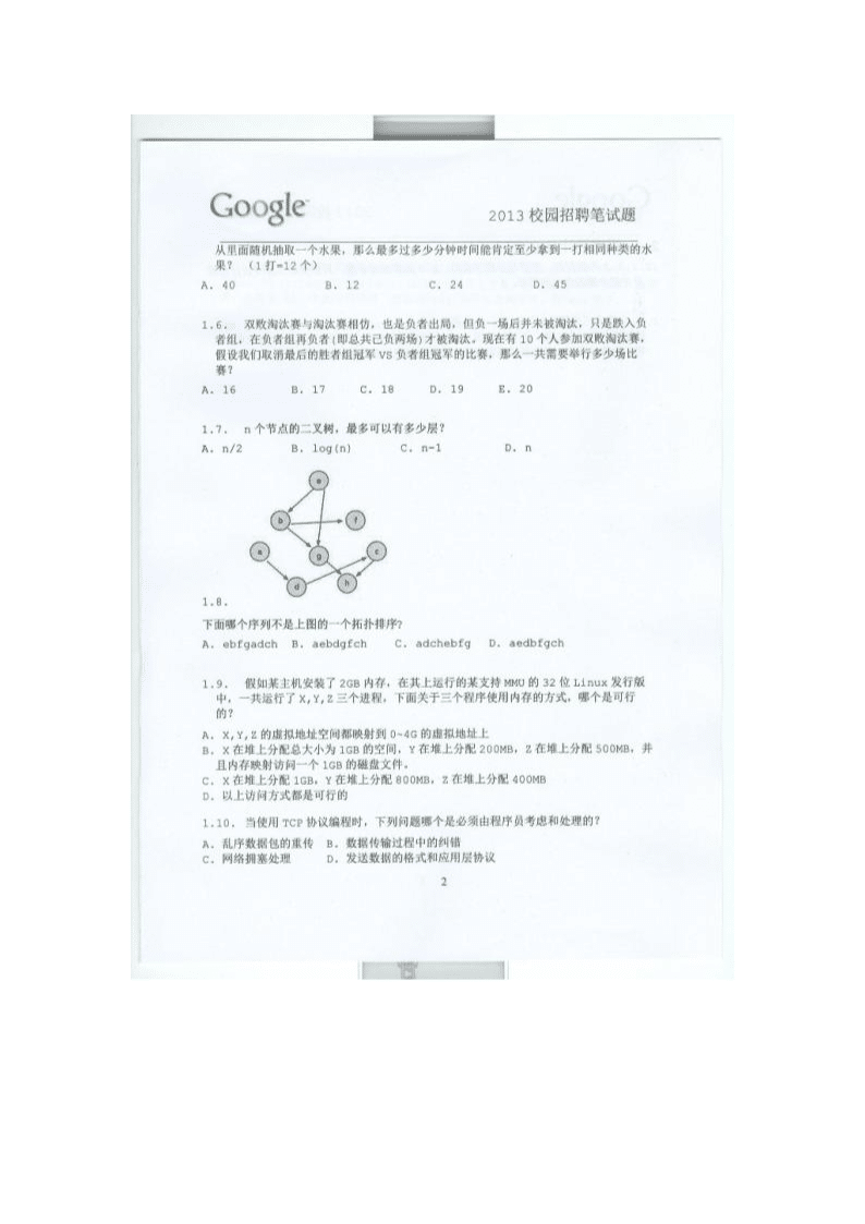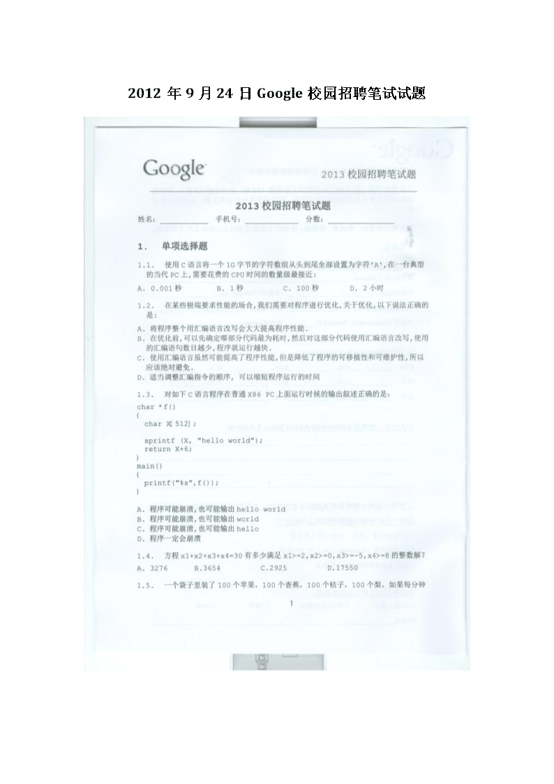 【文档名称】 2012年9月24日Google校园招聘笔试试题(图片版).doc