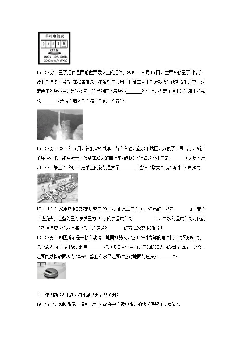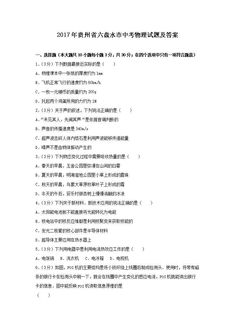 【文档名称】 2017年贵州省六盘水市中考物理试题及答案(Word版).doc