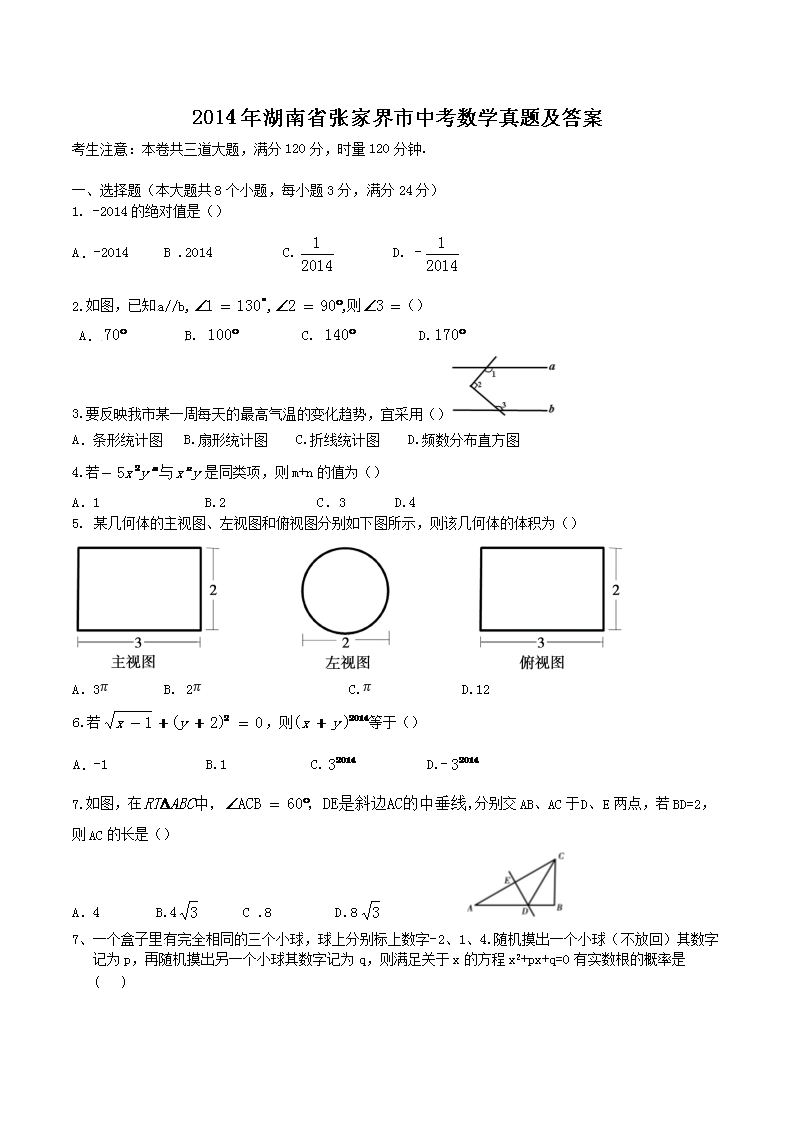 【文档名称】 2014年湖南省张家界市中考数学真题及答案(Word版).doc