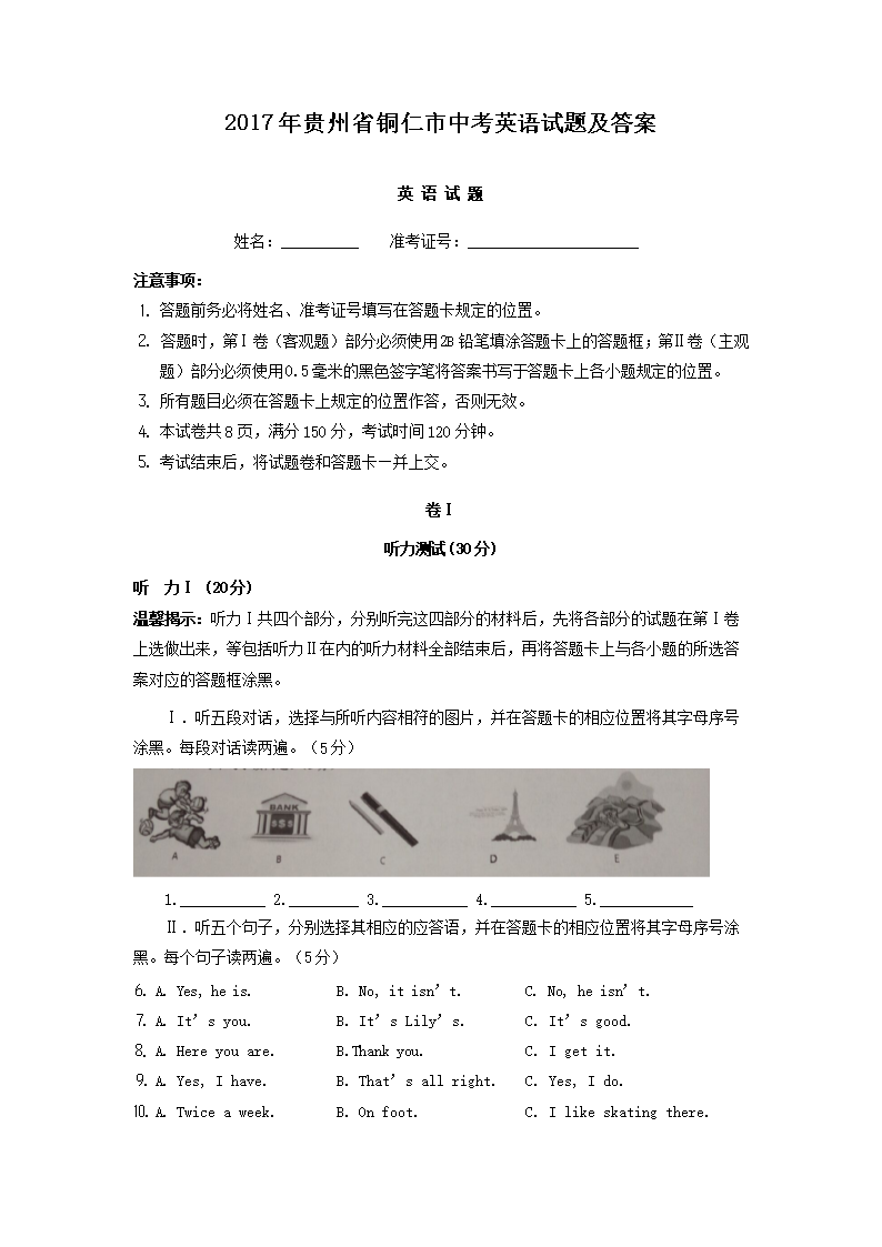 【文档预览】 无忧考网整理发布2017年贵州省铜仁市中考英语试题及答案(Word版),前五页预览如下: