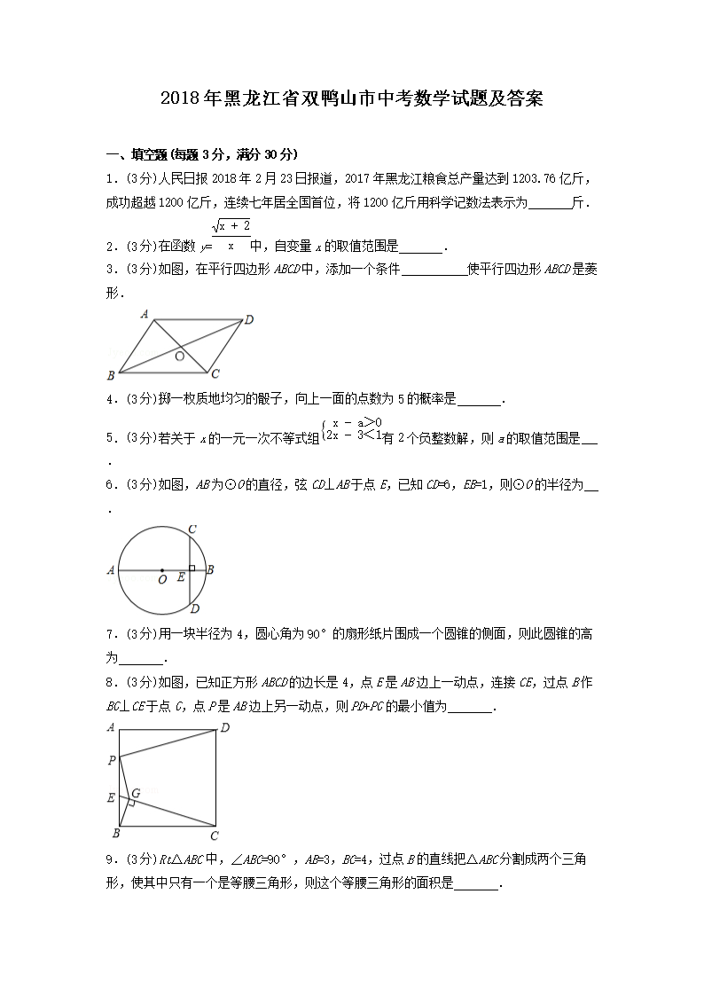 【文档名称】 2018年黑龙江省双鸭山市中考数学试题及答案(Word版).doc