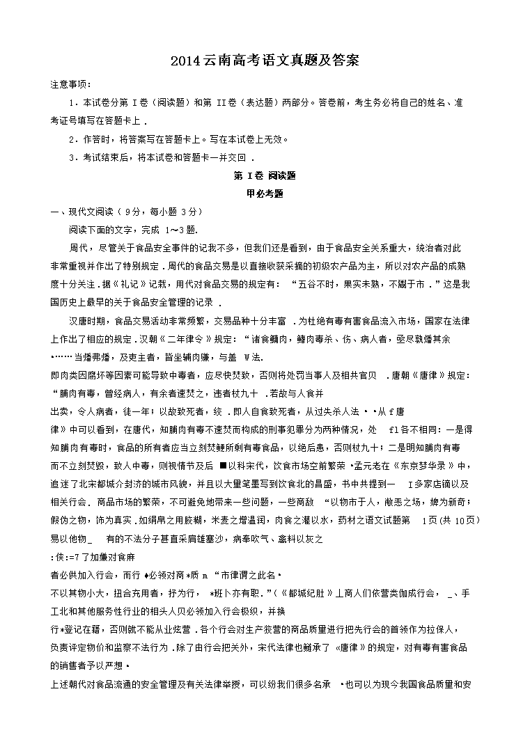 【文档名称】 2014云南高考语文真题及答案(Word版).doc