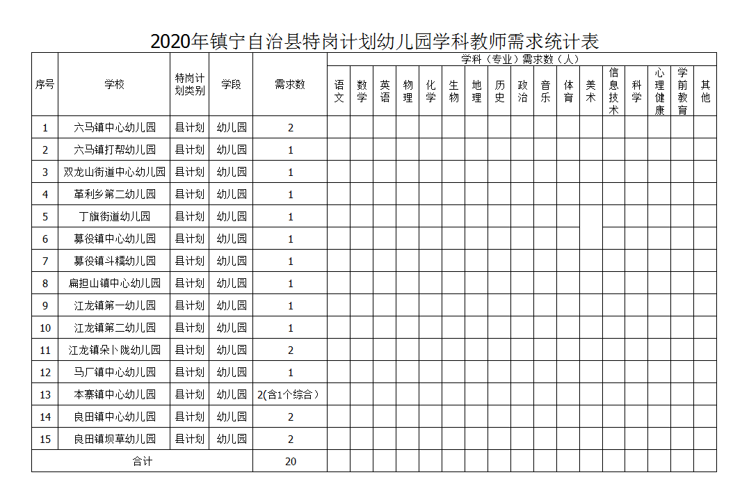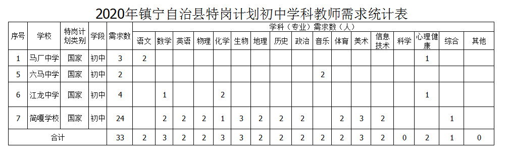 2020年我县“特岗计划”教师招聘计划数为100名,其中,中央“特岗计划”教师招聘80名,用于招聘农村中小学教师,其中初中33名、小学47名;地方“特岗计划”教师招聘20名,用于招聘农村幼儿园教师。具体学科岗位招聘计划详见《镇宁自治县2020年“特岗计划”教师招聘计划表》(附表)。
