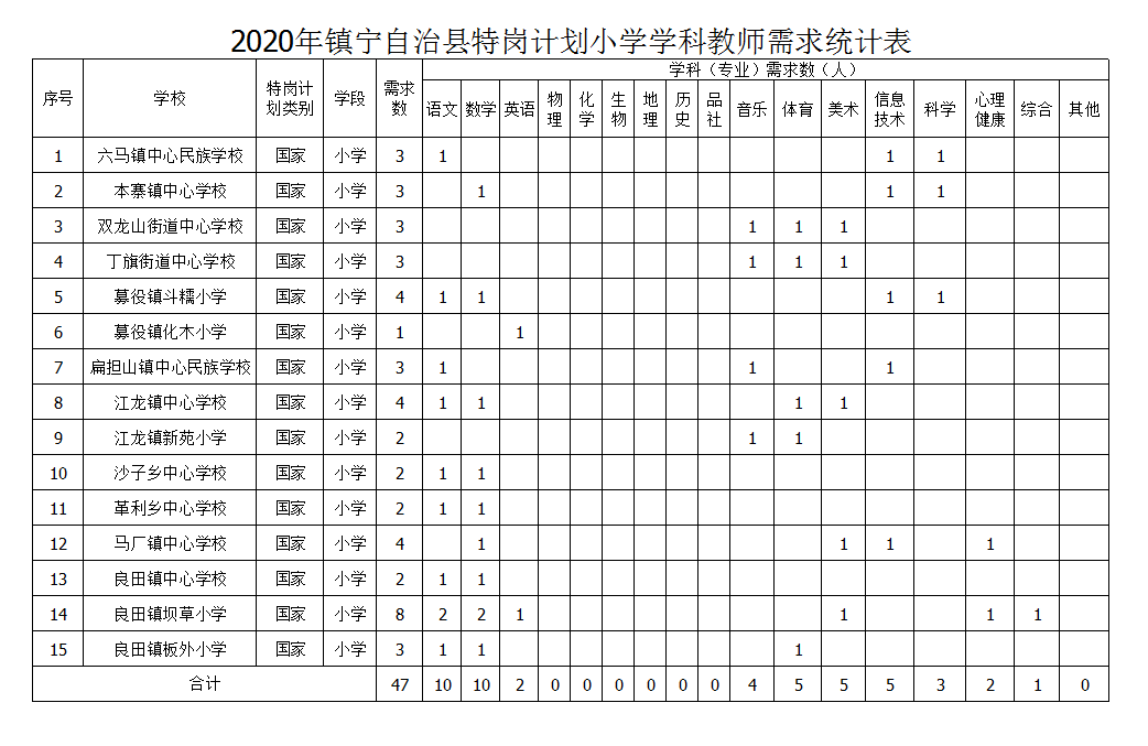 为做好我县2020年“特岗计划”实施工作,吸引优秀高校毕业生投身我县乡村教育事业,根据《教育部财政部人事部中央编办关于实施农村义务教育阶段学校教师特设岗位计划的通知》(教师〔2006〕2号)、《教育部办公厅财政部办公厅关于做好2020年农村义务教育阶段学校教师特设岗位计划实施工作的通知》(教师厅〔2020〕2号)、《省教育厅省委编办省财政厅省人力资源和社会保障厅关于印发<贵州省2020年农村义务教育阶段学校教师特设岗位计划实施方案>的通知》(黔教发〔2020〕36号)、《人力资源社会保障部教育部司法部农业农村部文化和旅游部国家卫生健康委国家知识产权局关于应对新冠肺炎疫情影响实施部分职业资格“先上岗、再考证”阶段性措施的通知》(人社部发〔2020〕24号)、《人社部等7部门有关司局负责同志就实施部分职业资格“先上岗、再考证”阶段性措施答记者问》、省教育厅教师工作处《关于调整上报“特岗计划”岗位学科设置有关事宜的通知》和《安顺市2020年“特岗计划”招聘公告》的工作安排,特制定本实施细则。一、招聘计划