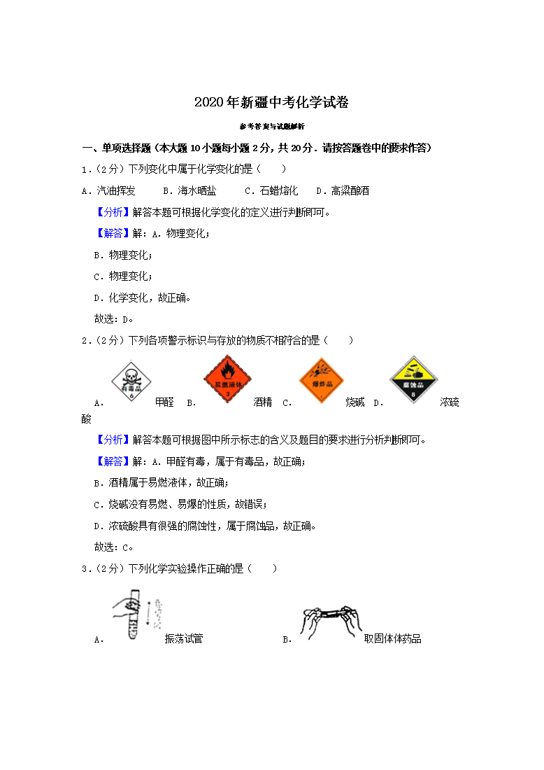 【文档名称】 2020年新疆乌鲁木齐中考化学真题及答案(Word版).doc