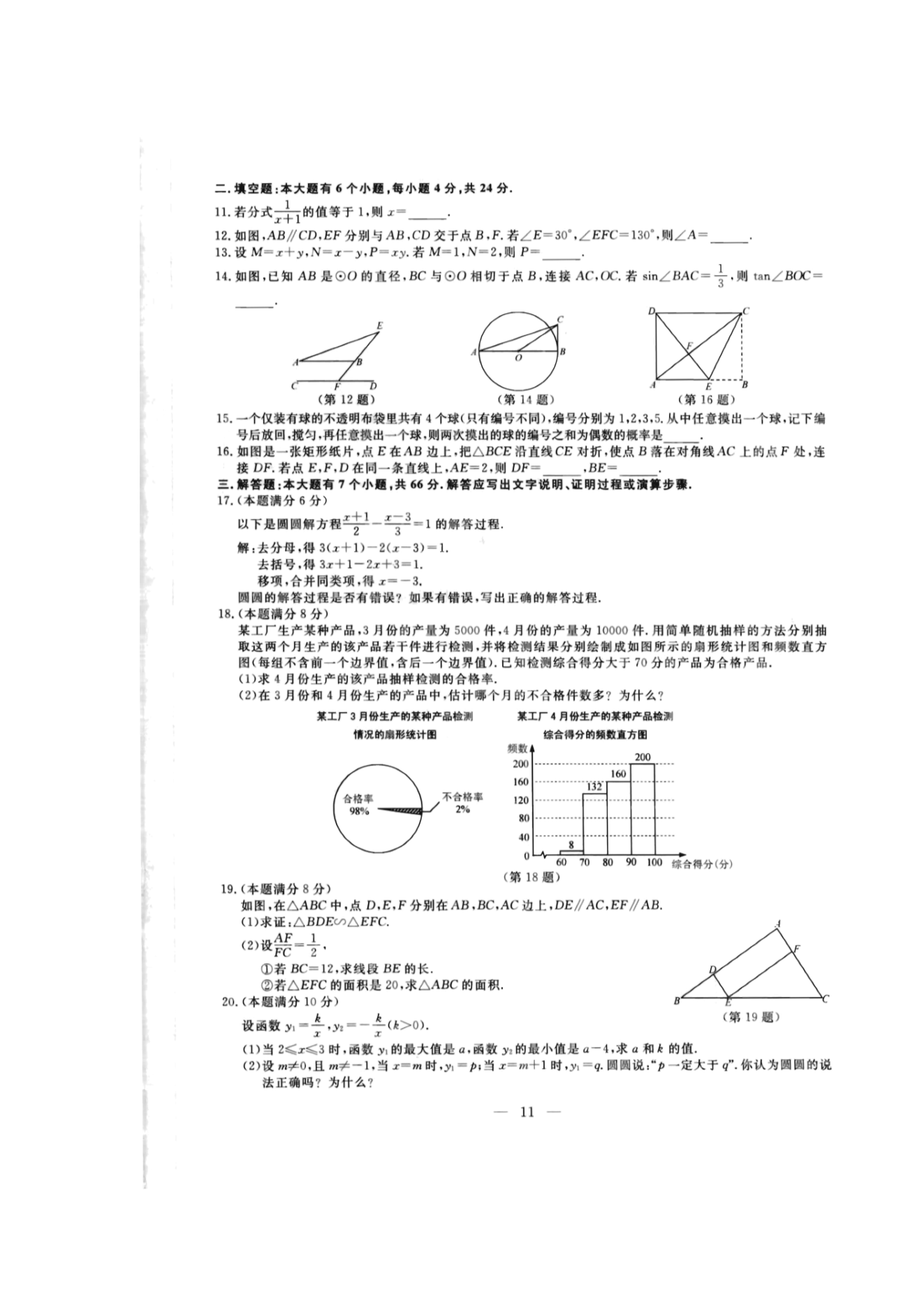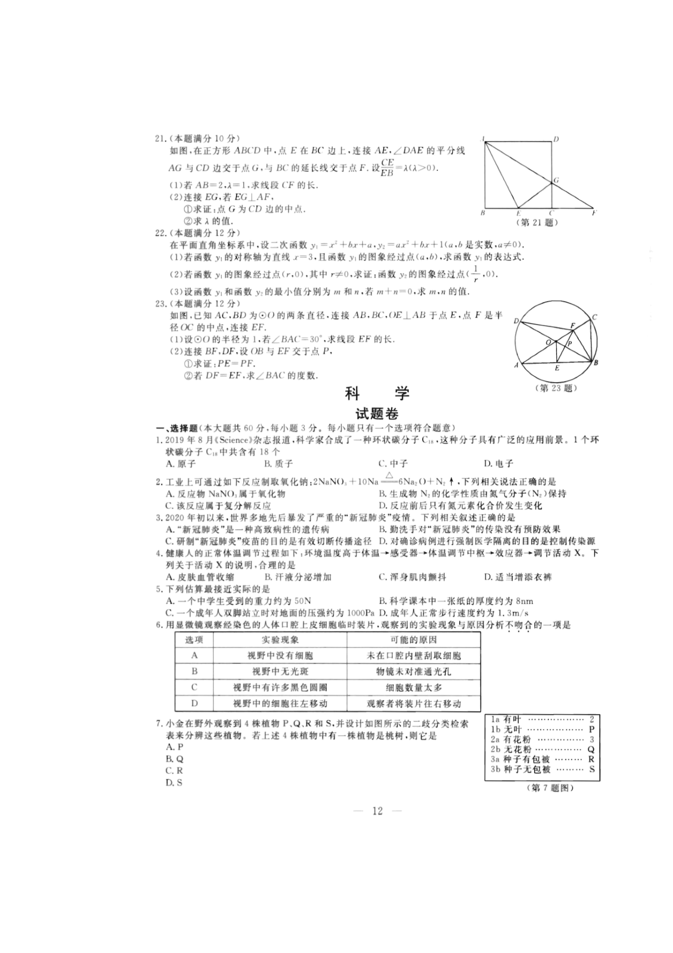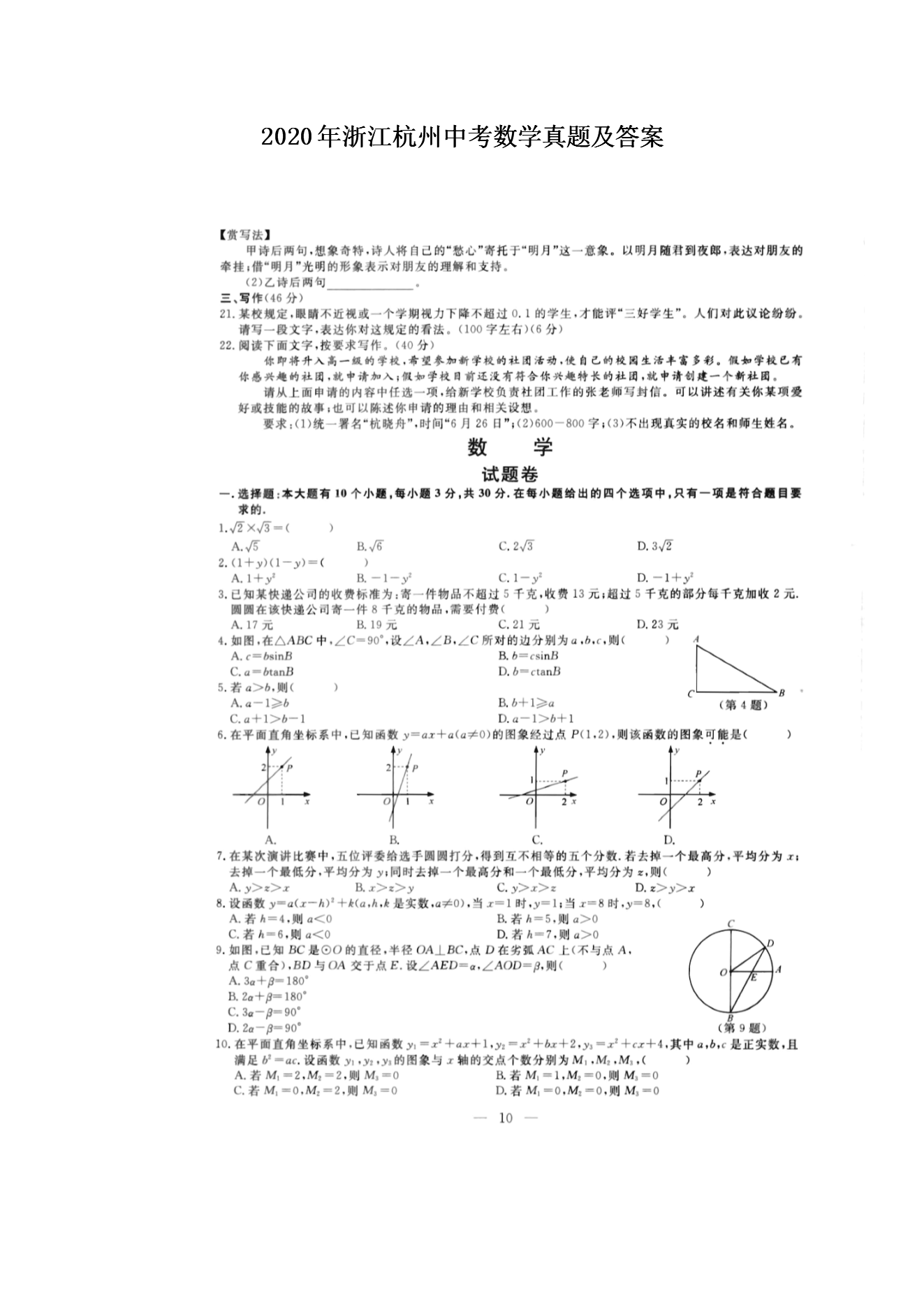 【文档名称】 2020年浙江杭州中考数学真题及答案(图片版).doc