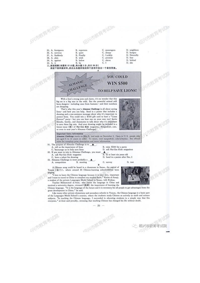 【文档预览】 无忧考网整理发布2020年浙江绍兴中考英语真题及答案(图片版),前五页预览如下: