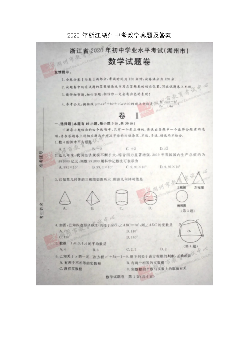 【文档名称】 2020年浙江湖州中考数学真题及答案(图片版).doc
