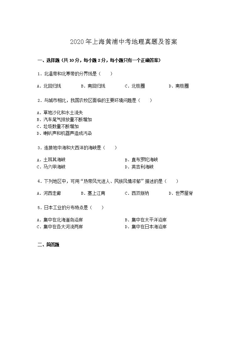【文档预览】 无忧考网整理发布2020年上海黄浦中考地理真题及答案(Word版),前五页预览如下:
