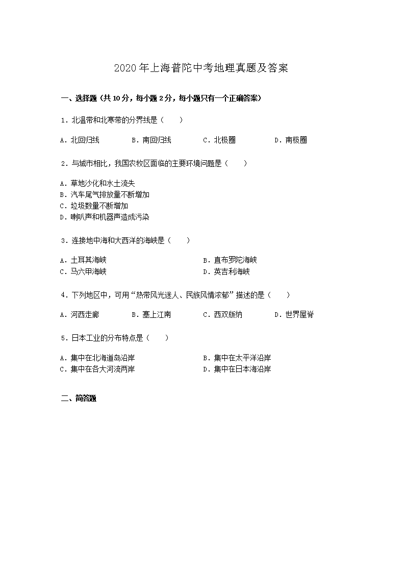 【文档预览】 无忧考网整理发布2020年上海普陀中考地理真题及答案(Word版),前五页预览如下: