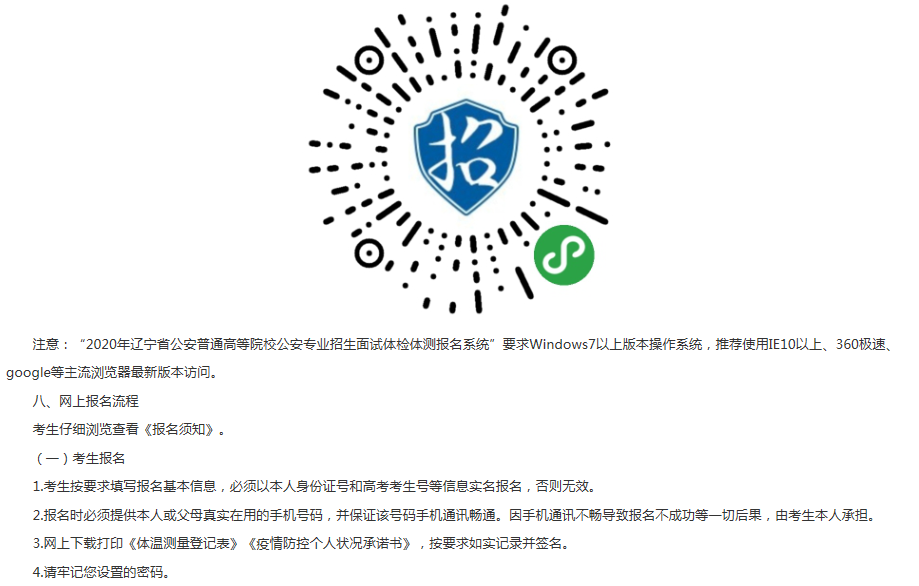 考网从辽宁省招生考试院了解到,2020年辽宁省公安普通高等院校公安专业招生面试体检体测政治考察网上报名公告已发布,为方便考生了解情况,现将有关事宜通知如下: