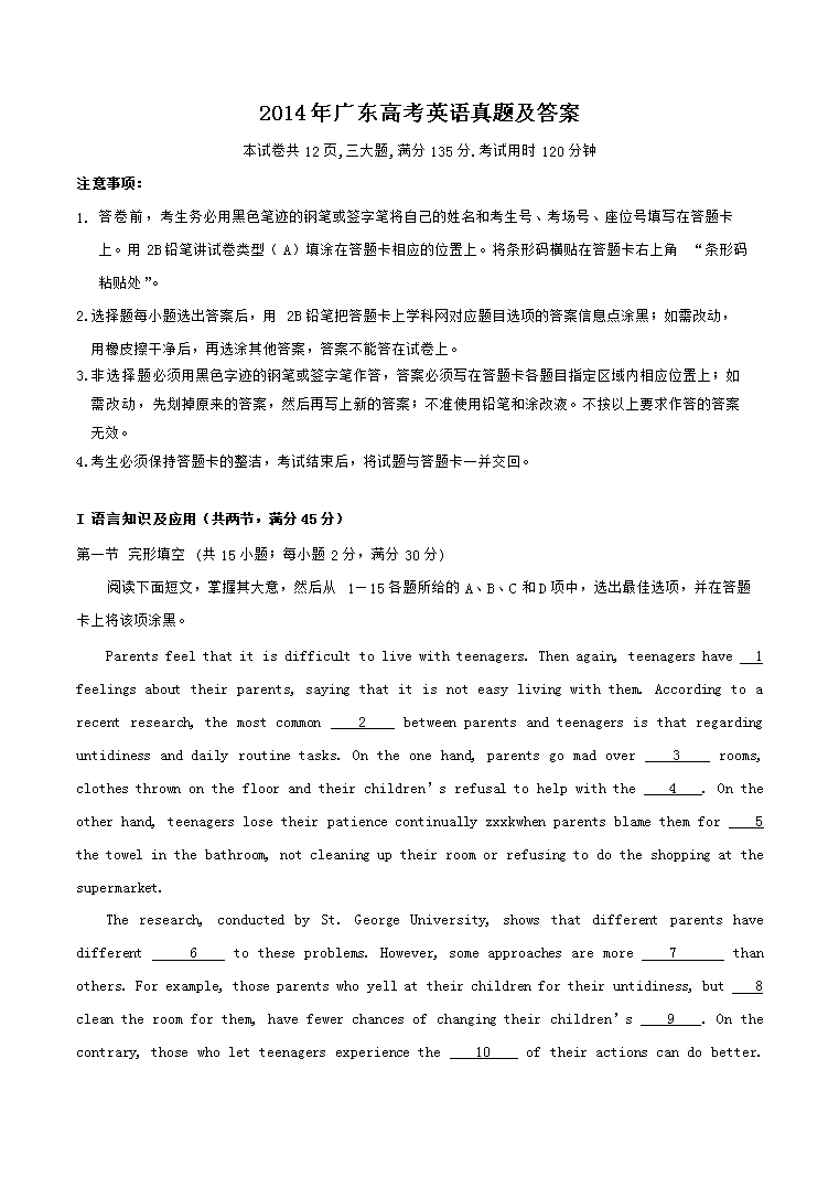 【文档名称】 2014年广东高考英语真题及答案(Word版).doc