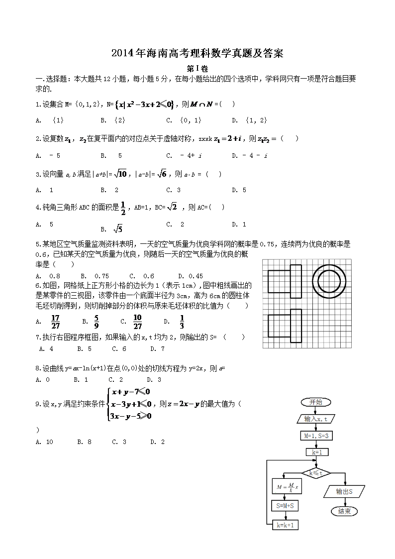 【文档名称】 2014年海南高考理科数学真题及答案(Word版).doc