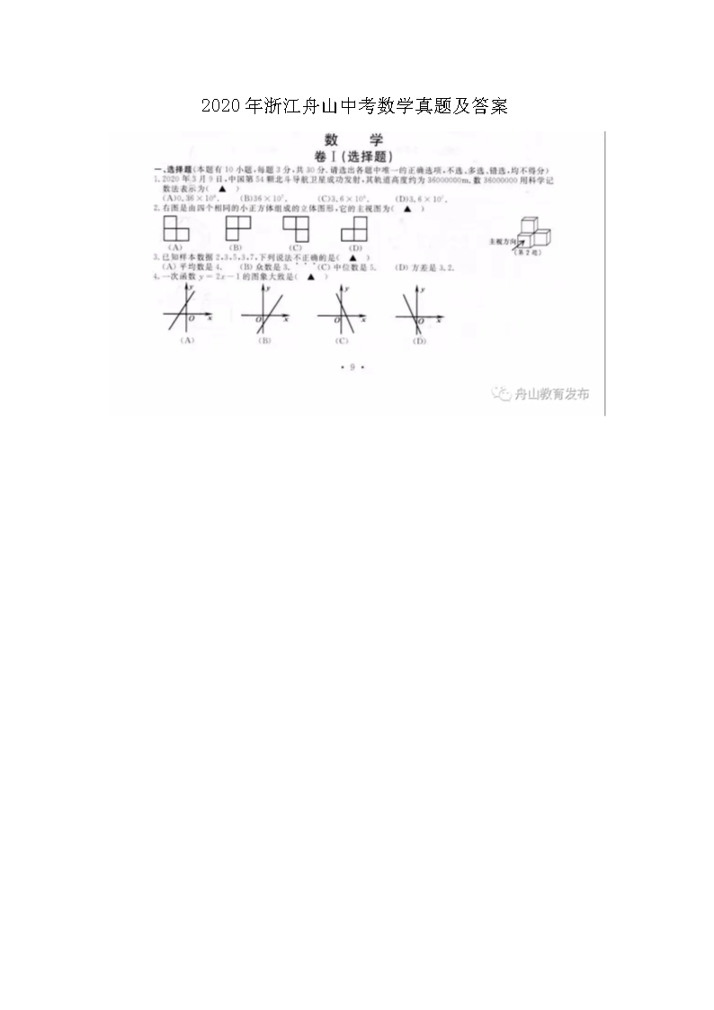 【文档名称】 2020年浙江舟山中考数学真题及答案(图片版).doc