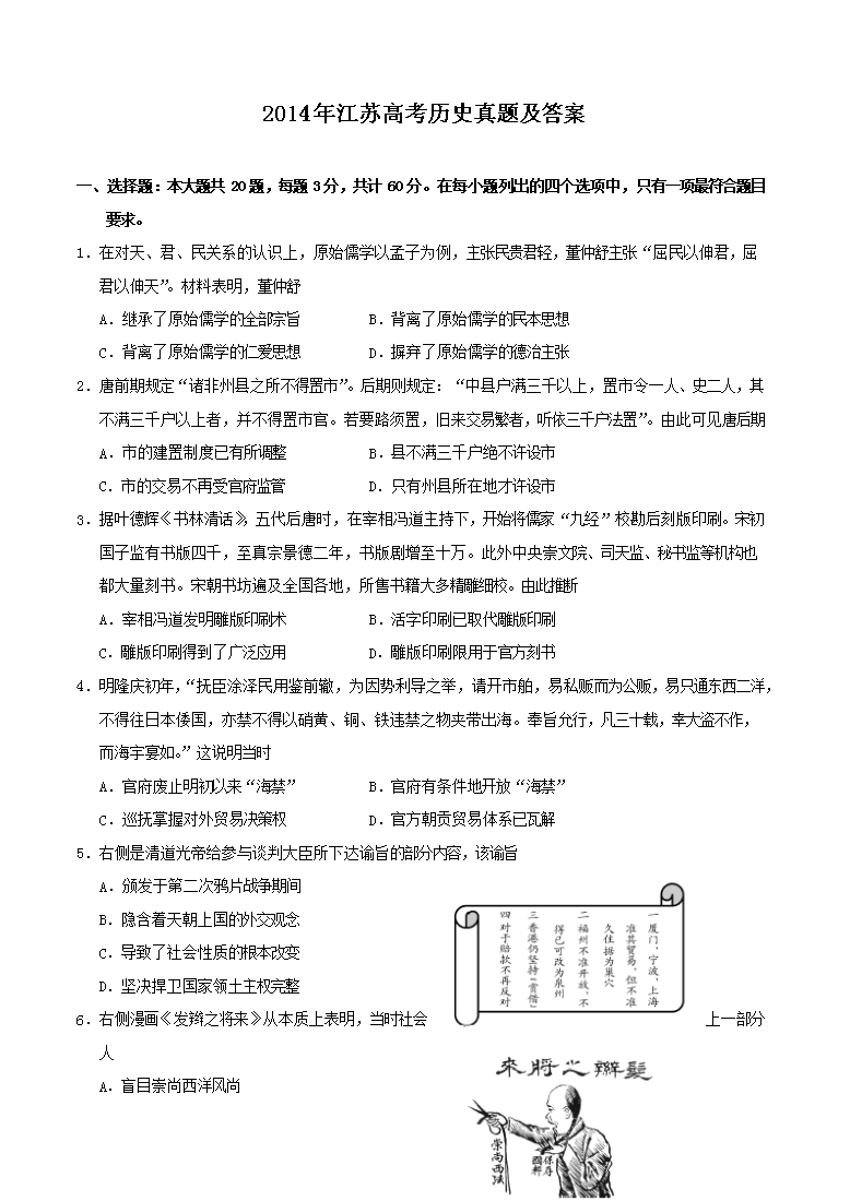 【文档名称】 2014年江苏高考历史真题及答案(Word版).doc