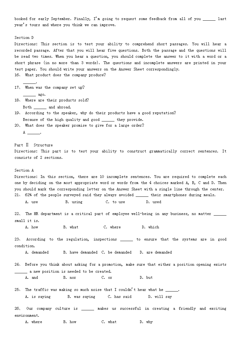 【文档名称】 2017年6月大学英语三级A真题及答案(Word版).doc