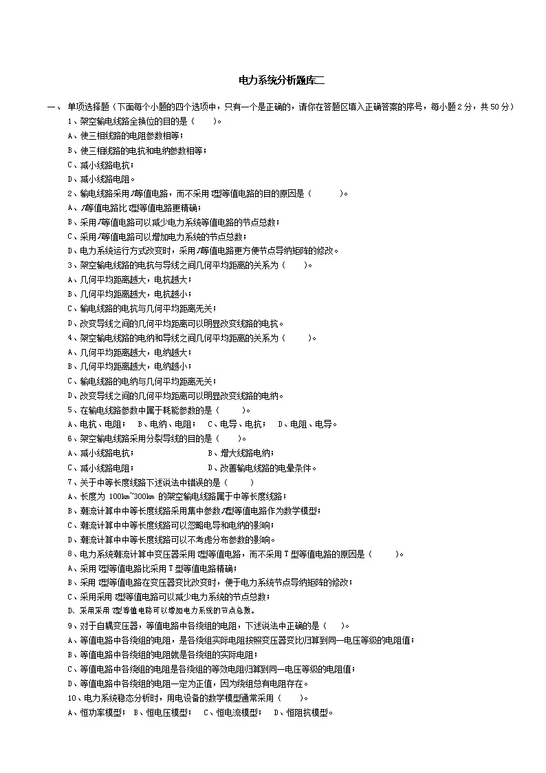 【文档名称】 国家电网考试电力系统分析题库含答案(Word版).doc