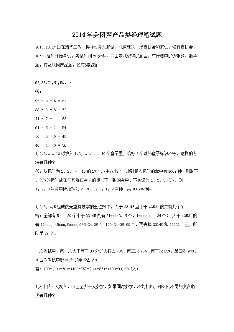 【文档名称】 2014年美团网产品类经理笔试题(Word版).doc