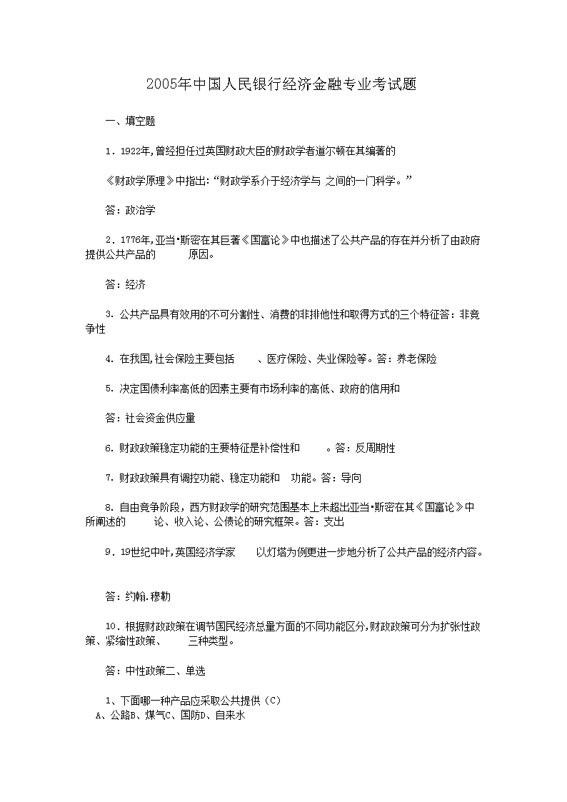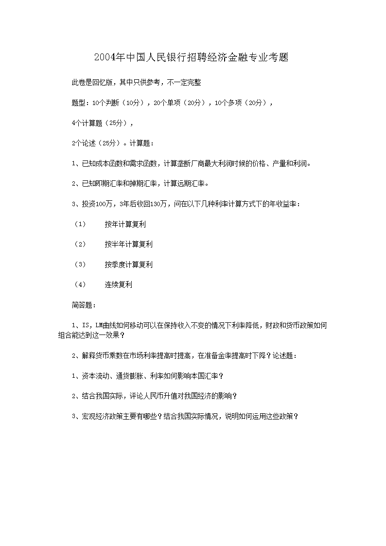 【文档名称】 2004至2005年中国人民银行招聘经济金融专业考题(Word版).doc