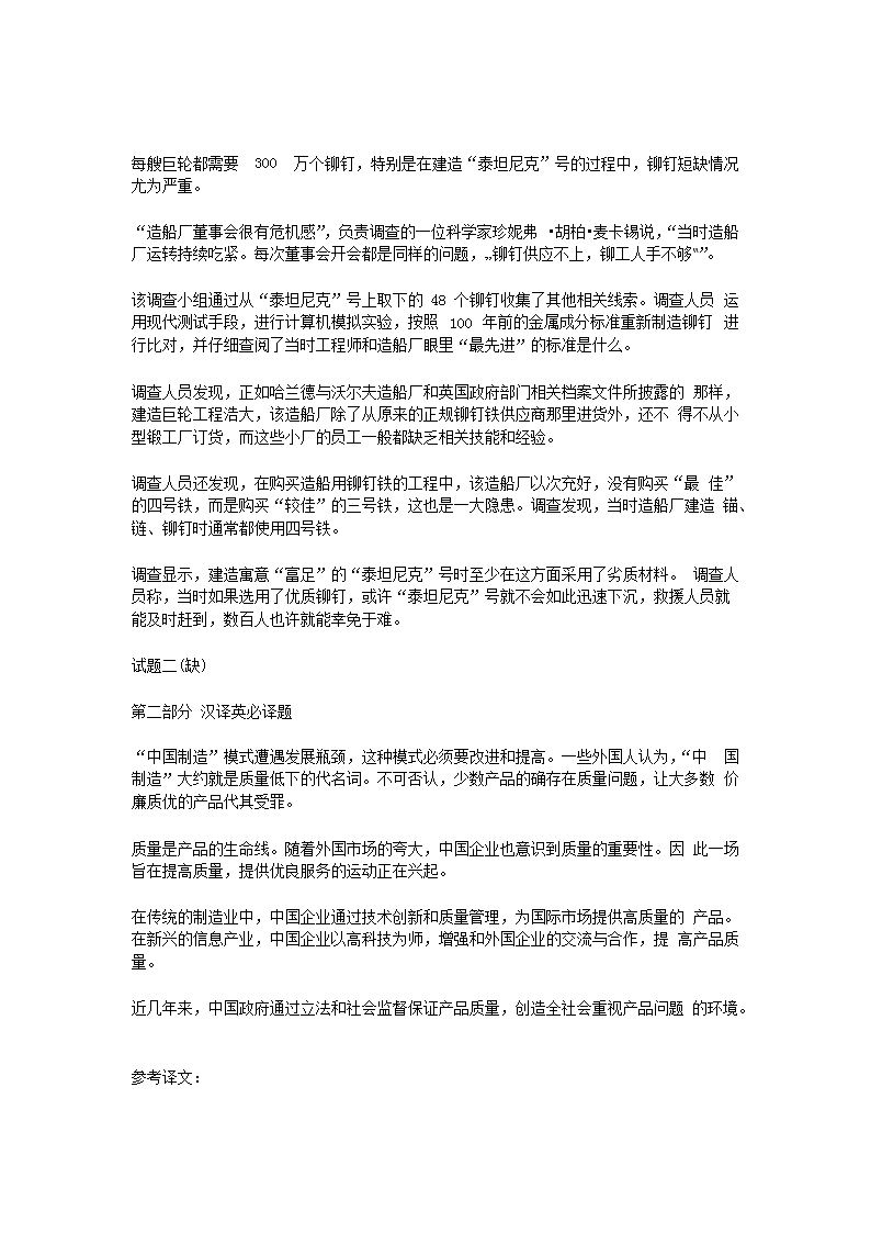【文档预览】 无忧考网整理发布2009年5月翻译资格考试二级英语笔译实务真题及答案(Word版),前五页预览如下: