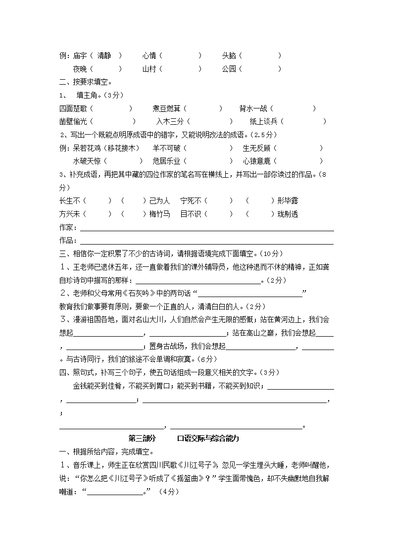 【文档名称】 2011年河南郑州中原区小学语文教师招聘考试真题及答案A卷(Word版).doc