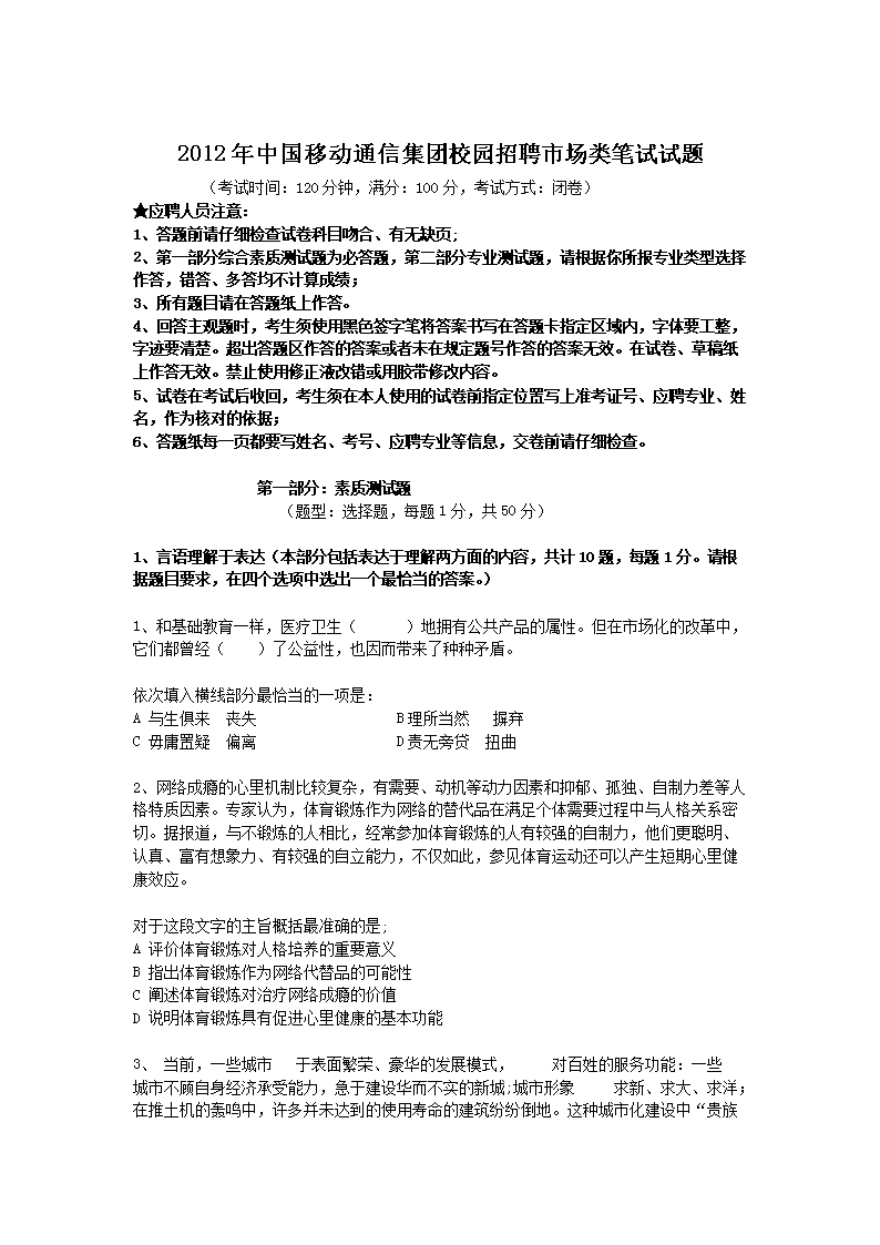 【文档名称】 2012年中国移动通信集团校园招聘市场类笔试试题(Word版).doc