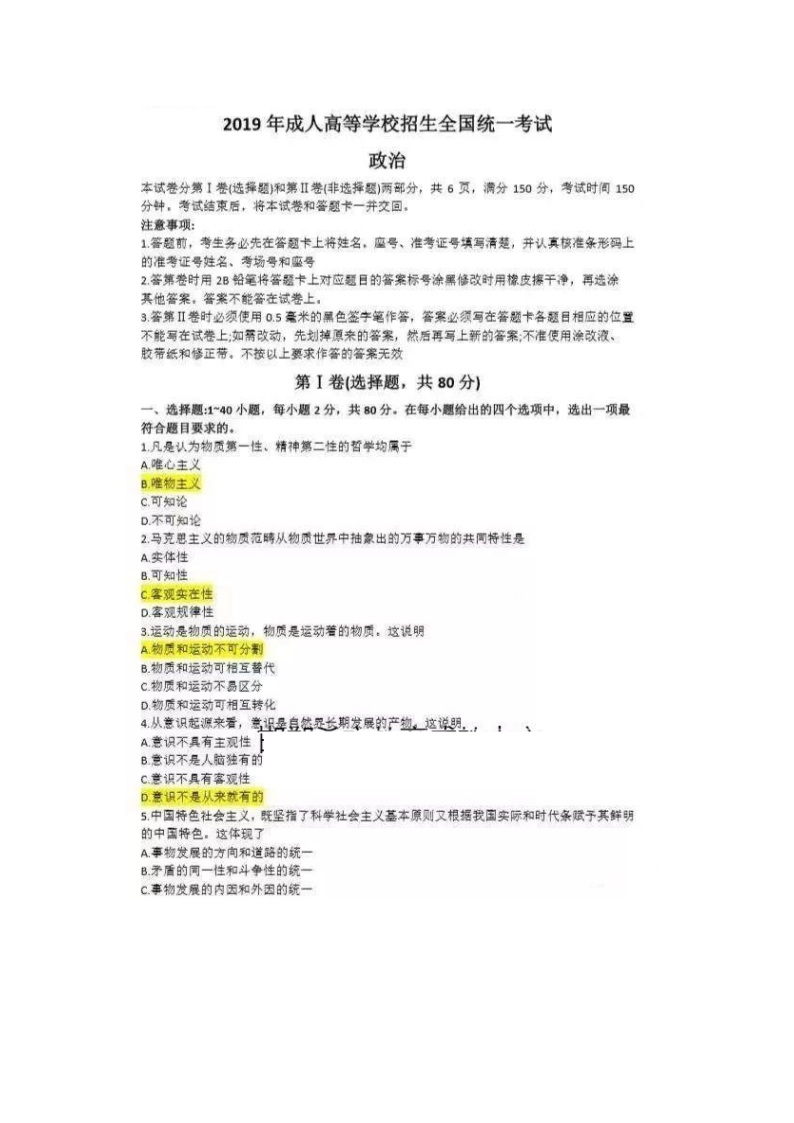 【文档名称】 2019年成人高考政治真题及答案解析(图片版).doc