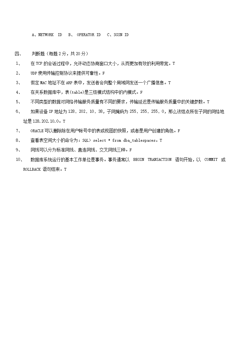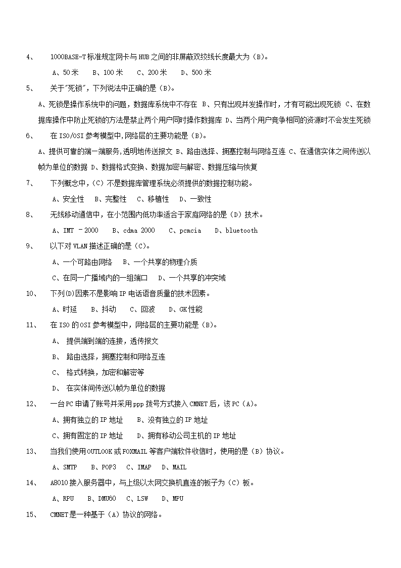 【文档名称】 2012年中国移动网管系统维护工程师试题及答案(Word版).doc