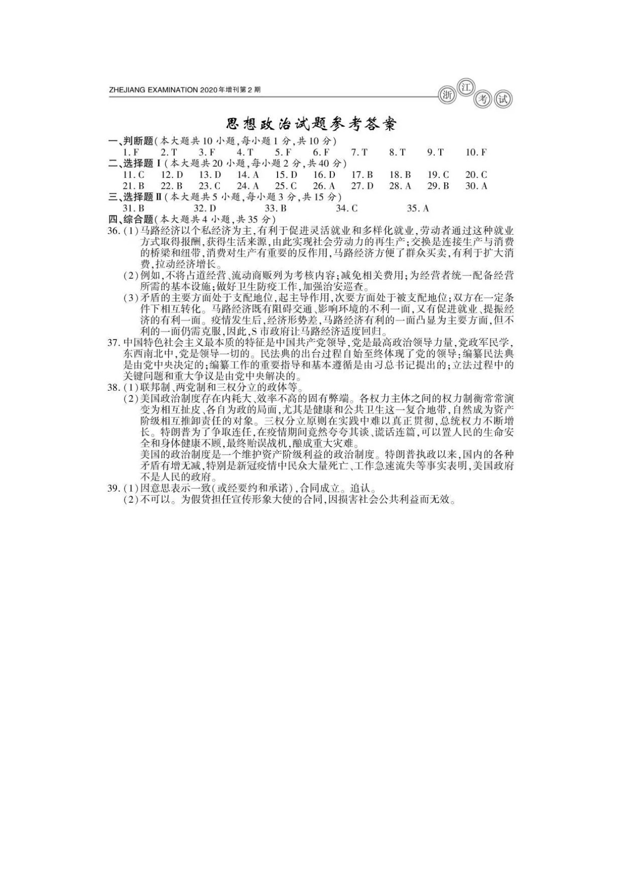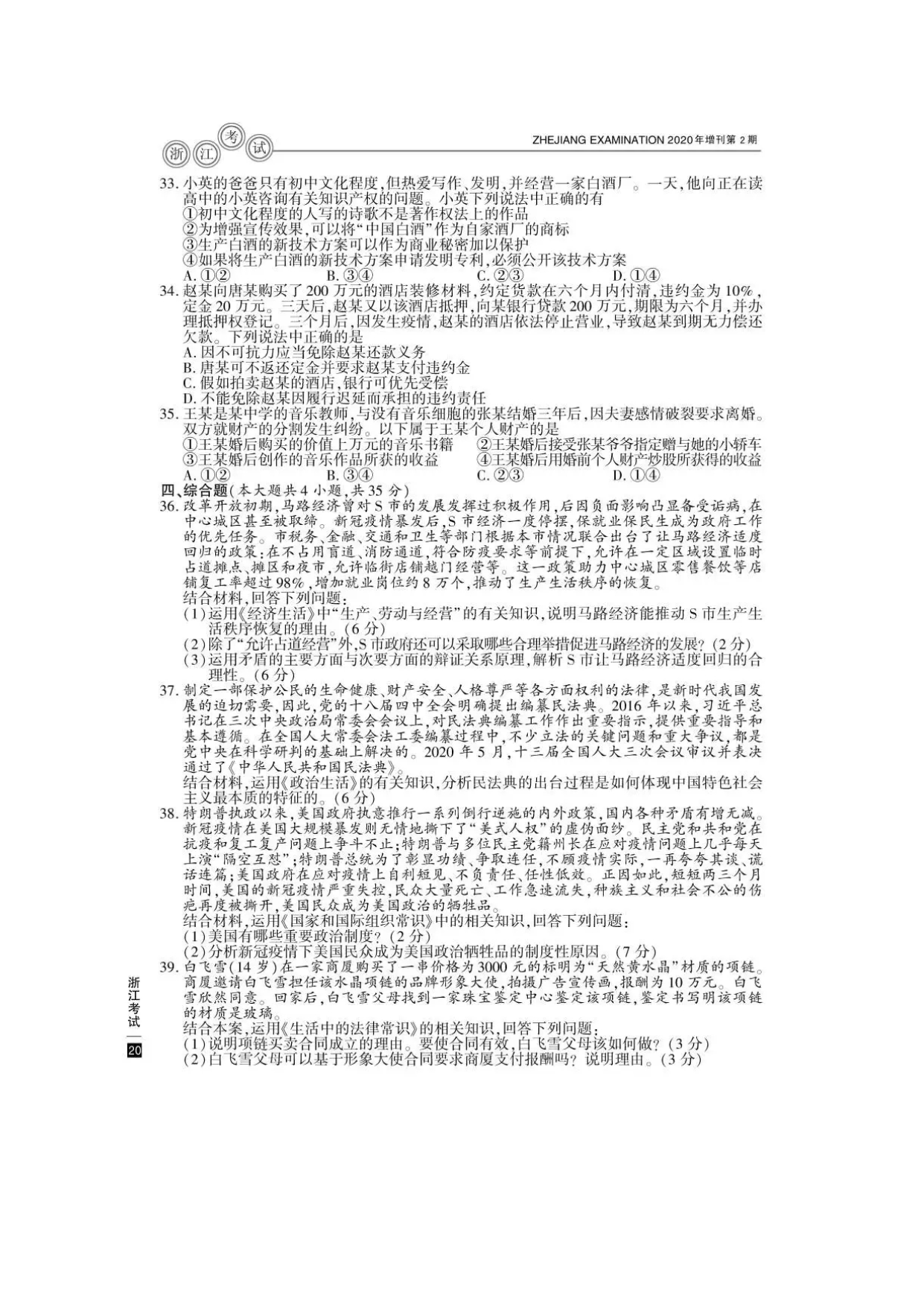 【文档名称】 2020年7月浙江普通高中学业水平考试政治真题及答案(图片版).doc