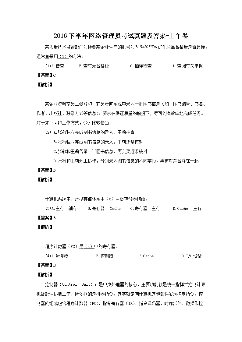 【文档名称】 2016下半年网络管理员考试真题及答案-上午卷(Word版).doc