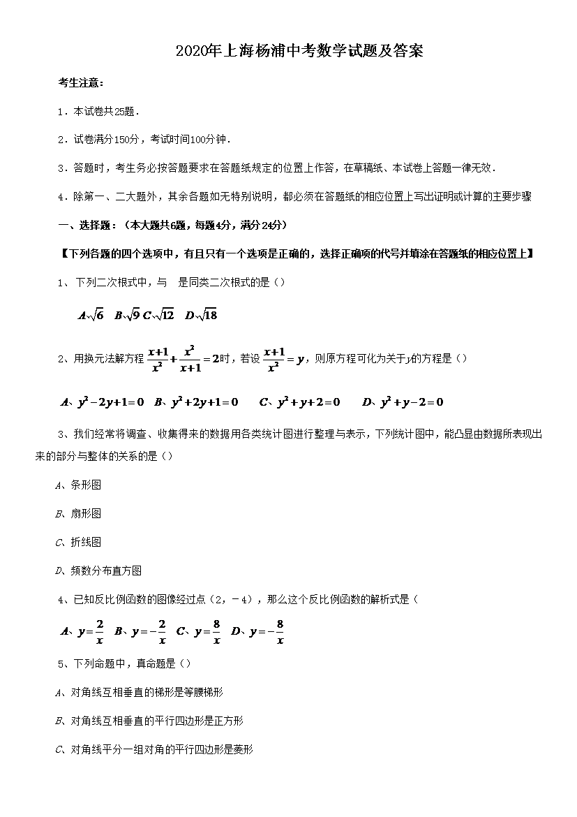 【文档名称】 2020年上海杨浦中考数学试题及答案(Word版).doc