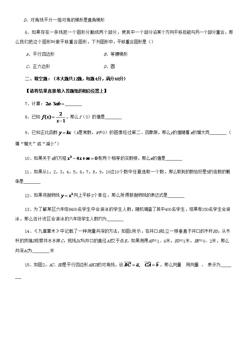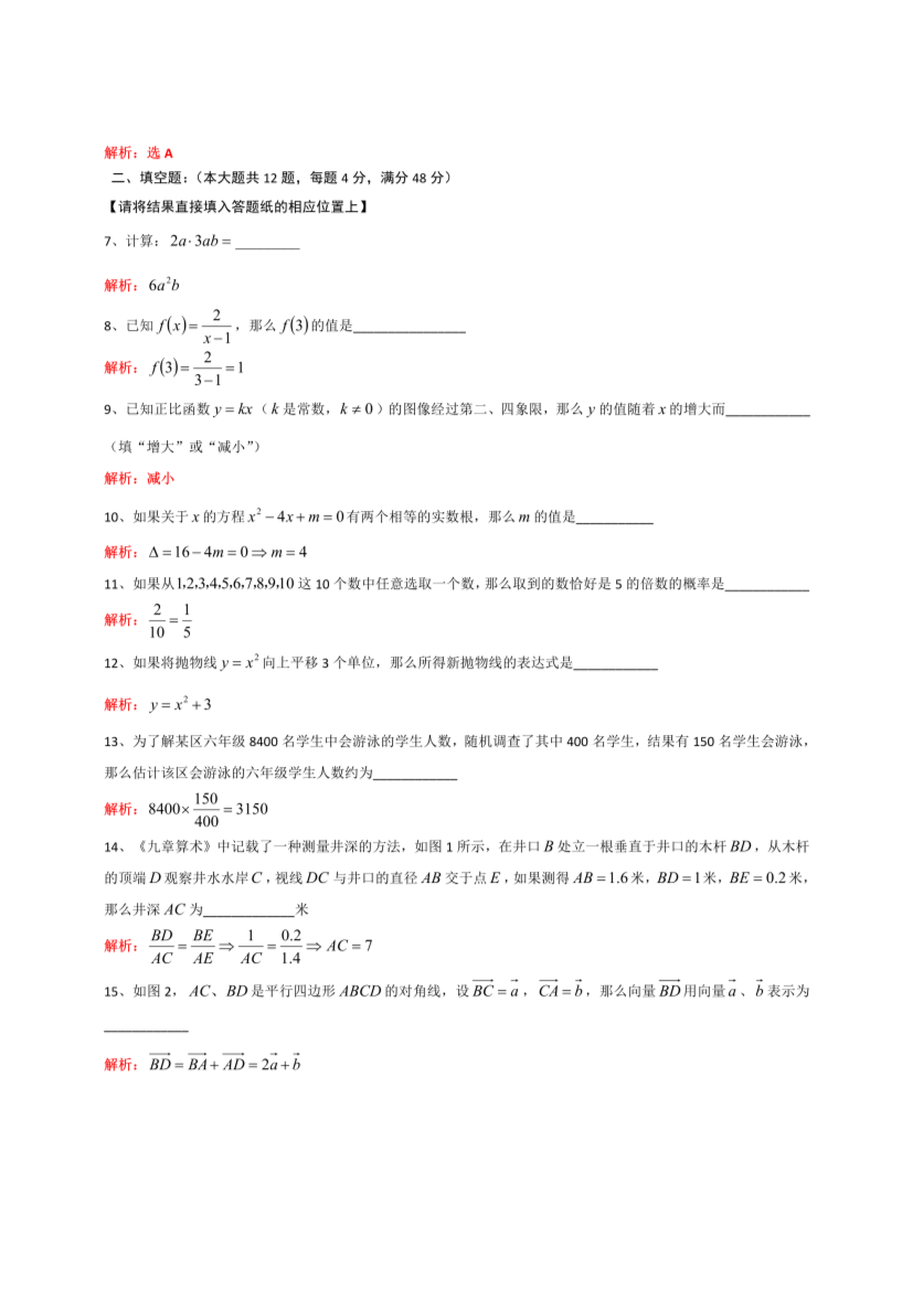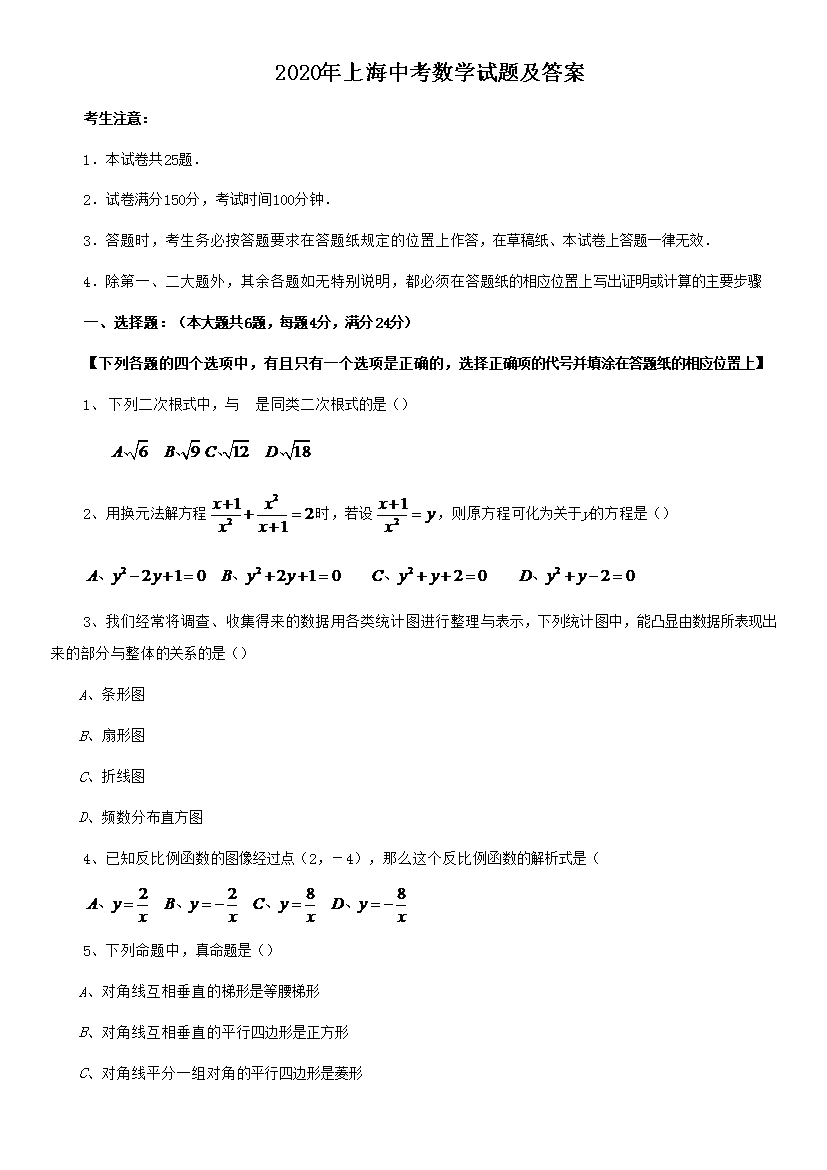 【文档名称】 2020年上海中考数学试题及答案(Word版).doc