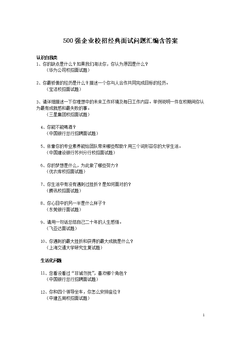 【文档名称】 500强企业校招经典面试问题汇编含答案(Word版).doc