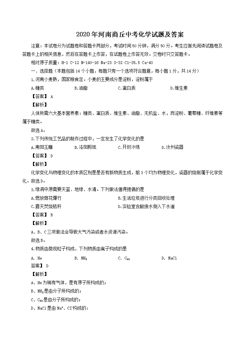 【文档名称】 2020年河南商丘中考化学试题及答案(Word版).doc