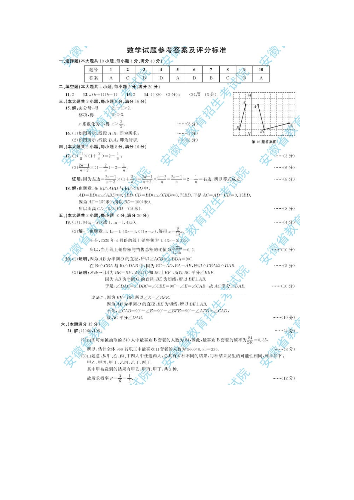 【文档预览】 无忧考网整理发布2020年安徽亳州中考数学真题及答案(图片版),前五页预览如下:
